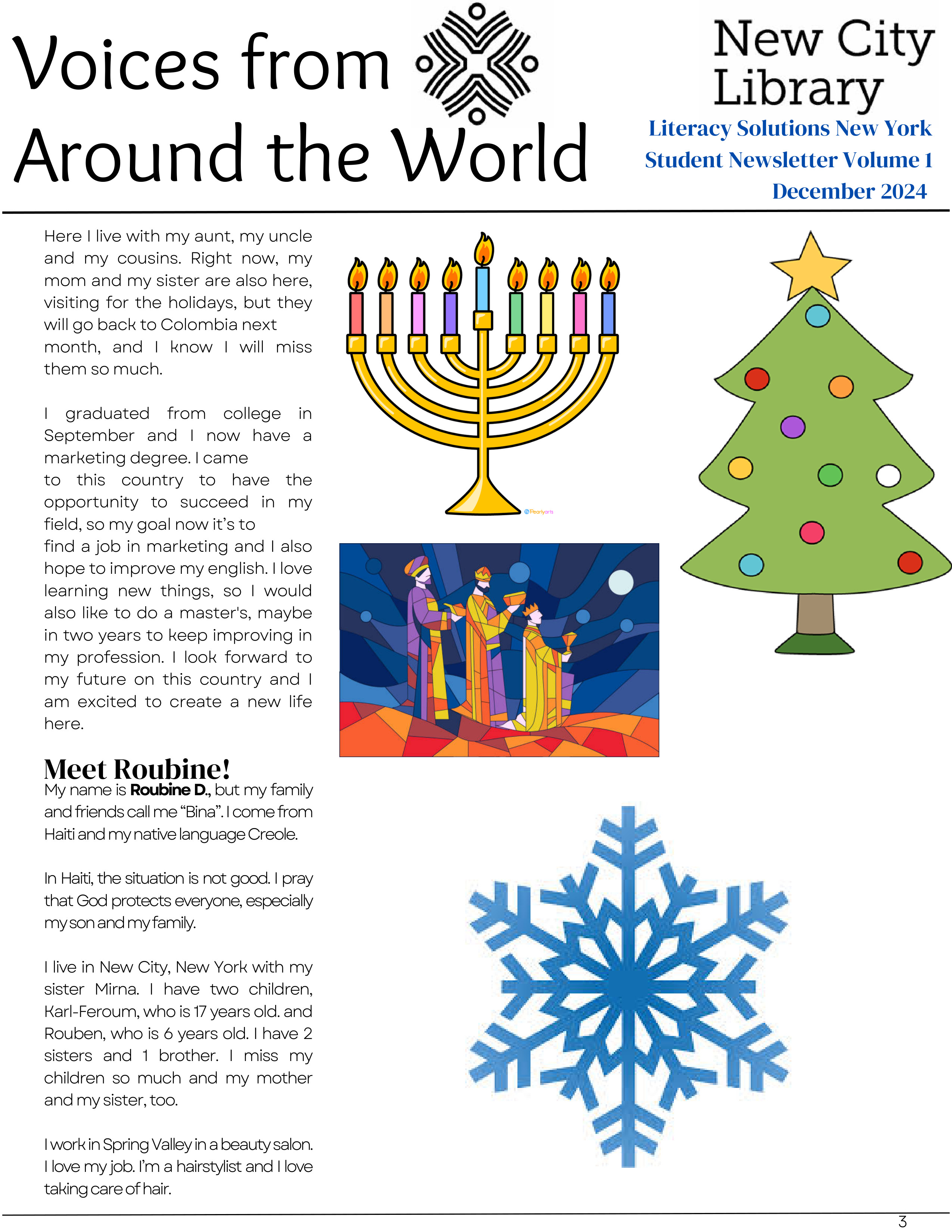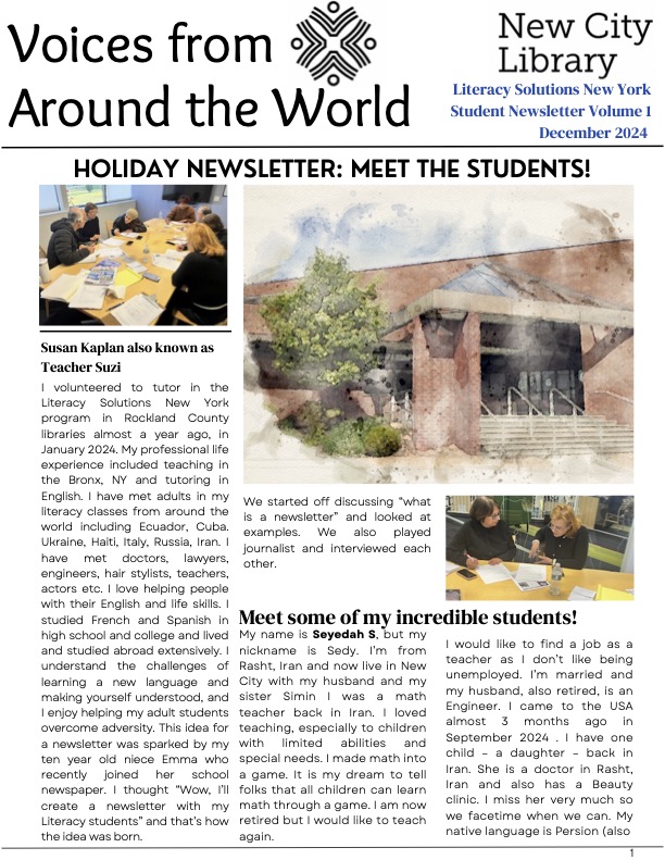 I volunteered to tutor in the Literacy Solutions New York program in Rockland County libraries in January 2024. My professional life experience included teaching in the Bronx, NY and tutoring in English. I have met adults in my literacy classes from around the world including Ecuador, Cuba, Ukraine, Haiti, Italy, Russia, and Iran. I have met doctors, lawyers, engineers, hair stylists, teachers, actors, and more.