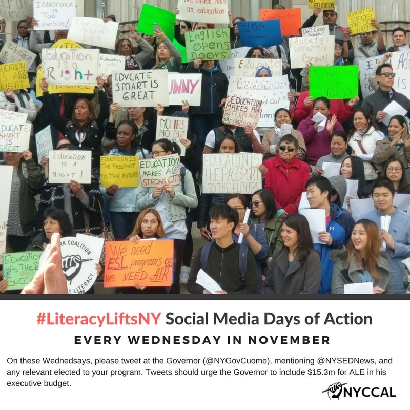 1. Every Wednesday in November (November 8th, November 15th, November 22nd, and November 29th) will be a #LiteracyLiftsNY social media day of action! On these Wednedsays, please tweet at the Governor (@NYGovCuomo) mentioning NYSED (@NYSEDNews) and any relevant elected ??? to your program. Tweets should urge him to include $15.3m for ALE in his executive budget.